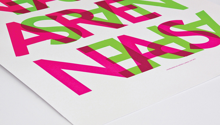 O cartaz criado para a exposição em homenagem ao artista plástico Edgardo Arenas, conhecido apenas como Arenas, explora graficamente a sobreposição de duas palavras: APENAS ARENAS. Assim estava em seu cartão de visita e era como o próprio artista costumava se apresentar. Serigrafia no formato 66 x 96cm, impressa a partir de uma única tela, com duas orientações e cores diferentes, causando sobreposição. Serigrafia: Estúdio Elástico.